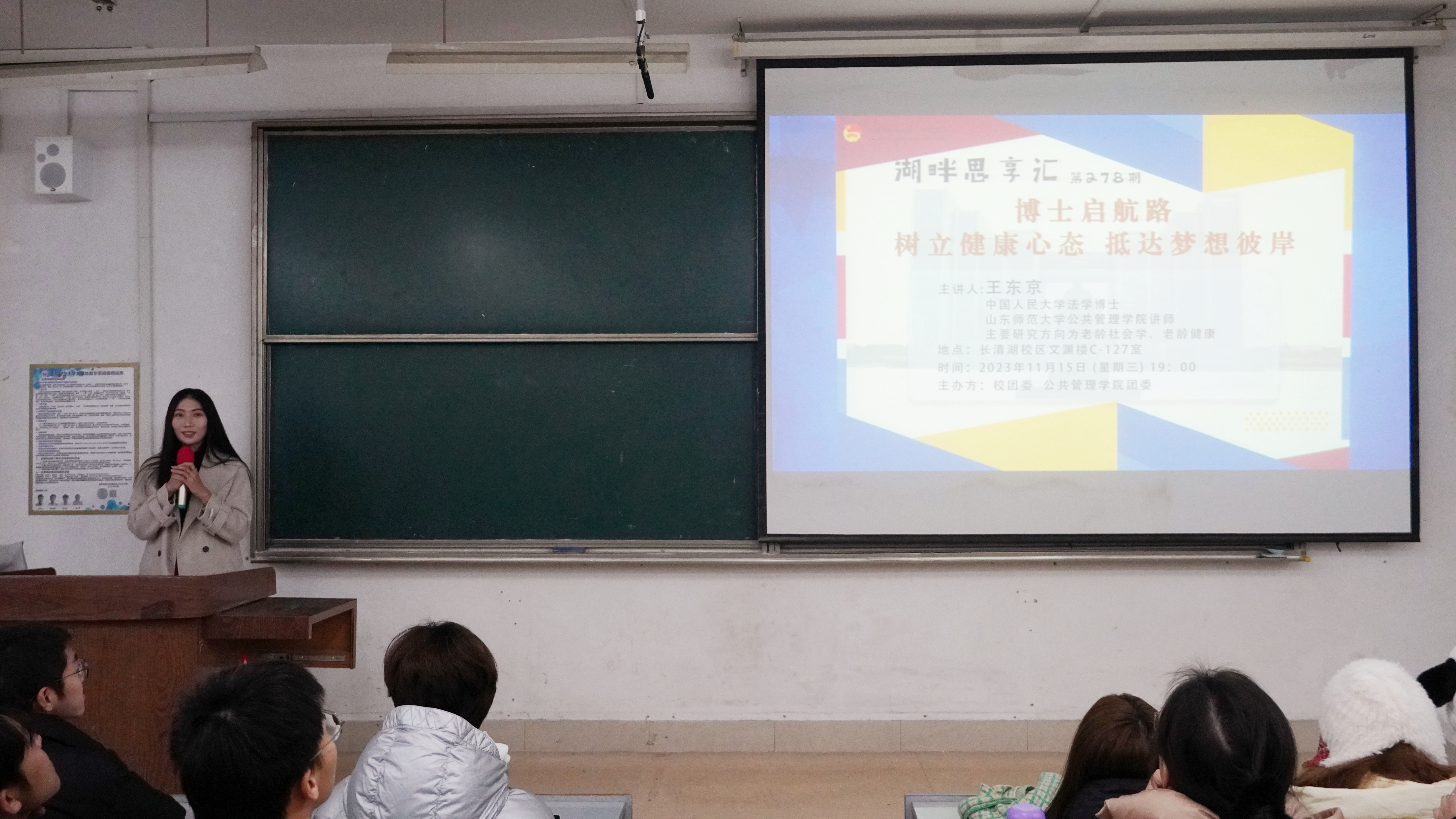 为帮助2023级本科生树立积极的价值观,明确人生规划,11月15日,由校团委与公共管理学院团委主办的“树立健康心态、抵达梦想彼岸”湖畔思享汇于长清湖校区文渊楼C127教室成功举办。本次活动邀请公共管理学院讲师王东京为主讲嘉宾,2023级全体本科生积极与会学习。